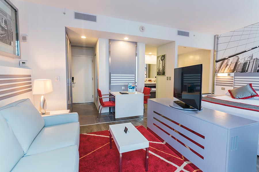 Las 29 plantas del Hotel Riu Plaza New York Times Square destacan por su diseño vanguardista y elegante, así como sus más de 600 habitaciones perfectamente acondicionadas con mini nevera, mesa de trabajo, TV con conexiones multimedia, aire acondicionado y calefacción central, entre otros, para ofrecerte la máxima comodidad. Entre sus instalaciones podrás encontrar el bar Fashion, "The Theater Buffet" y el bar Capital, un Grab & Go característico de la ciudad. Además, en nuestro hotel junto a Times Square podrás disfrutar de consigna de equipaje, botella de agua en las habitaciones, acceso ilimitado al gimnasio y otros servicios incluidos con el suplemento de facility fee.