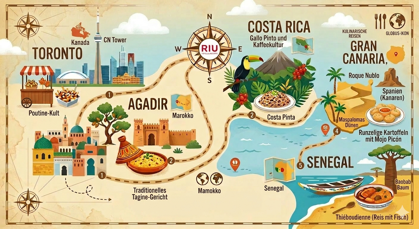 19 März, 2026Bei RIU Hotels & Resorts wissen wir, dass es, um eine Reise in vollen Zügen zu genießen, unerlässlich ist, sich gut auszuruhen und neue Energie zu tanken. Aber wir wissen auch, dass ein Teil dieser Energie daraus entsteht, die lokale Kultur durch den Gaumen zu entdecken. Reisende, die unsere Hotels in Agadir, Toronto oder Guanacaste wählen, suchen ein authentisches Eintauchen, das mit der lokalen Gastronomie beginnt.